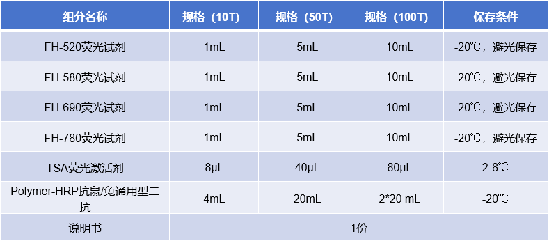 由于每次体系中都只有单一抗体孵育,因此无需担心抗体交叉反应,以及一抗二抗种属匹配问题,大大减少了实验设计时不同种属抗体选择匹配的限制。也就是说,使用TSA技术,同一张片子上所有的靶标都可以选用特异性高的兔单克隆抗体。搭配同一支抗兔的HRP二抗就可以进行实验。本公司开发的试剂盒所使用的酪胺荧光染料可单独或配合使用以实现单标、双标、三标及更多重荧光放大/多重同源抗体荧光标记等功能。
