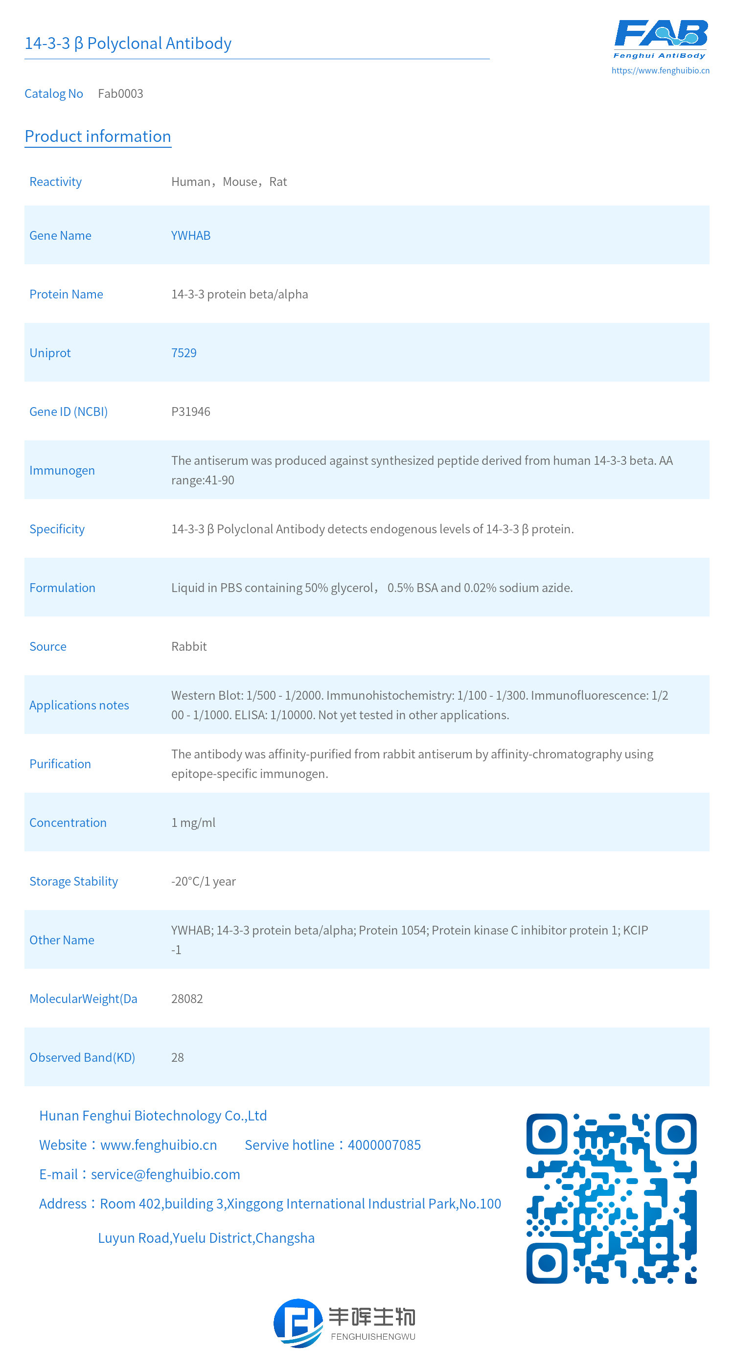 - Specificity: 14-3-3 β Polyclonal Antibody detects endogenous levels of 14-3-3 β protein.