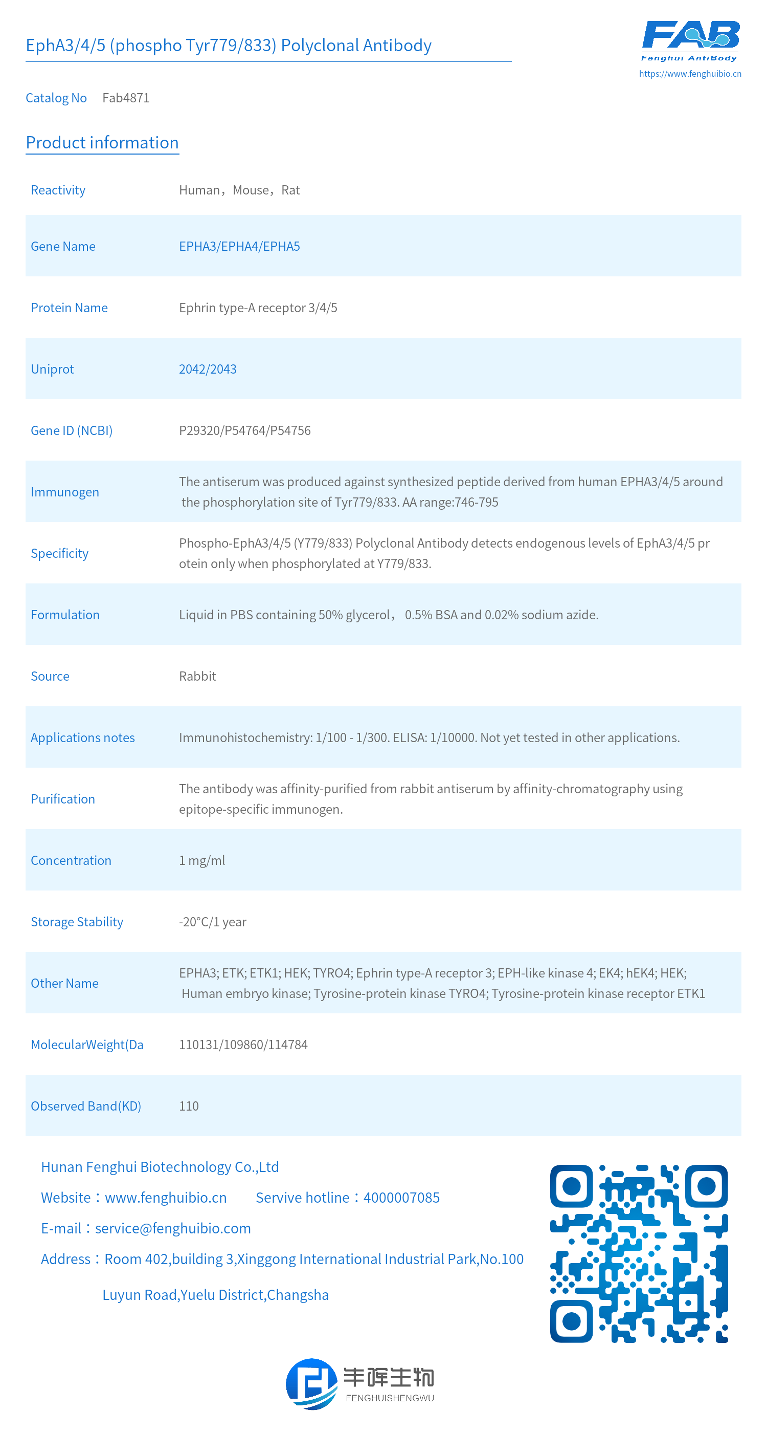 - Specificity: Phospho-EphA3/4/5 (Y779/833) Polyclonal Antibody detects endogenous levels of EphA3/4/5 protein only when phosphorylated at Y779/833.