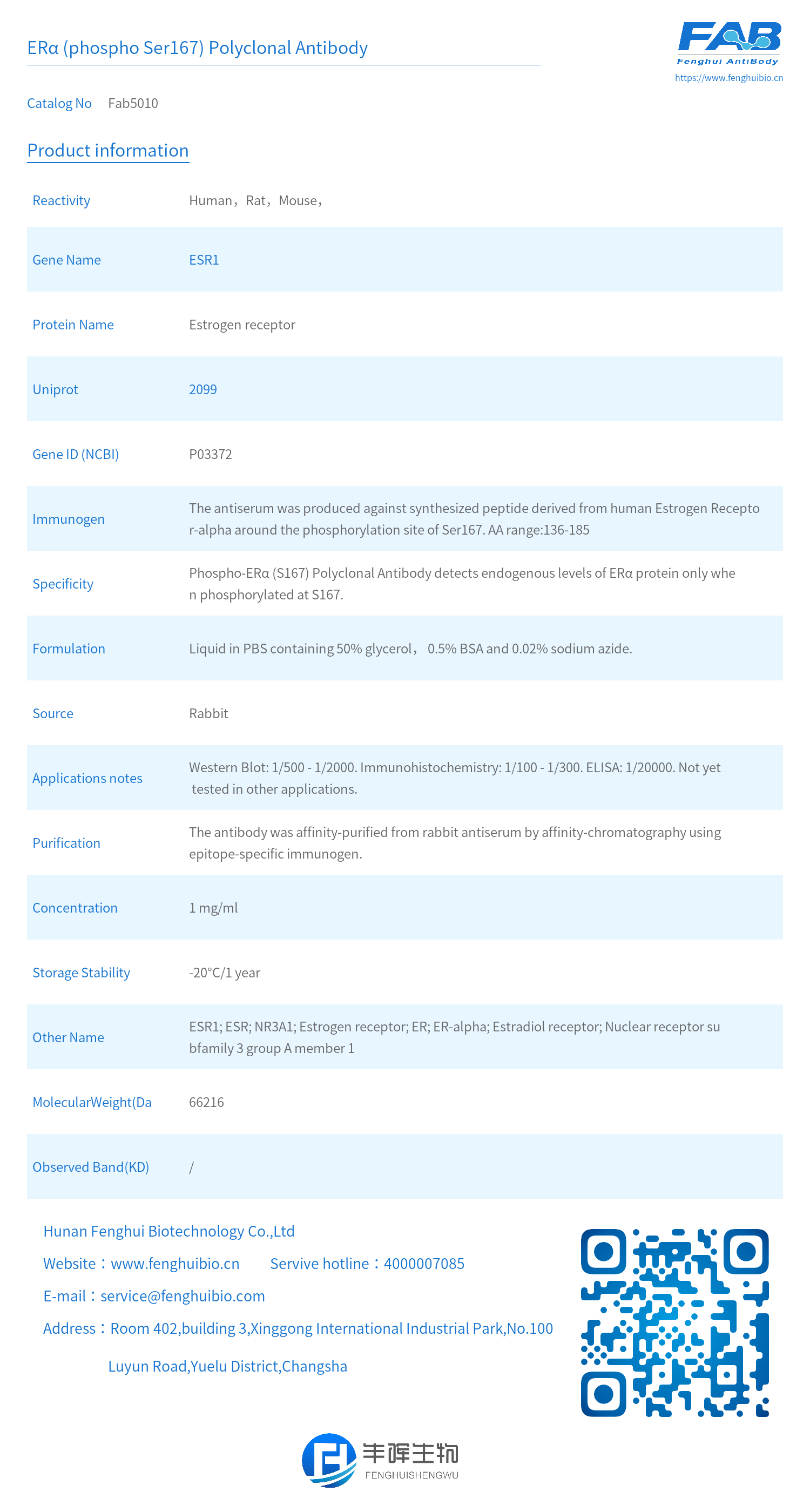 - Specificity: Phospho-ERα (S167) Polyclonal Antibody detects endogenous levels of ERα protein only when phosphorylated at S167.