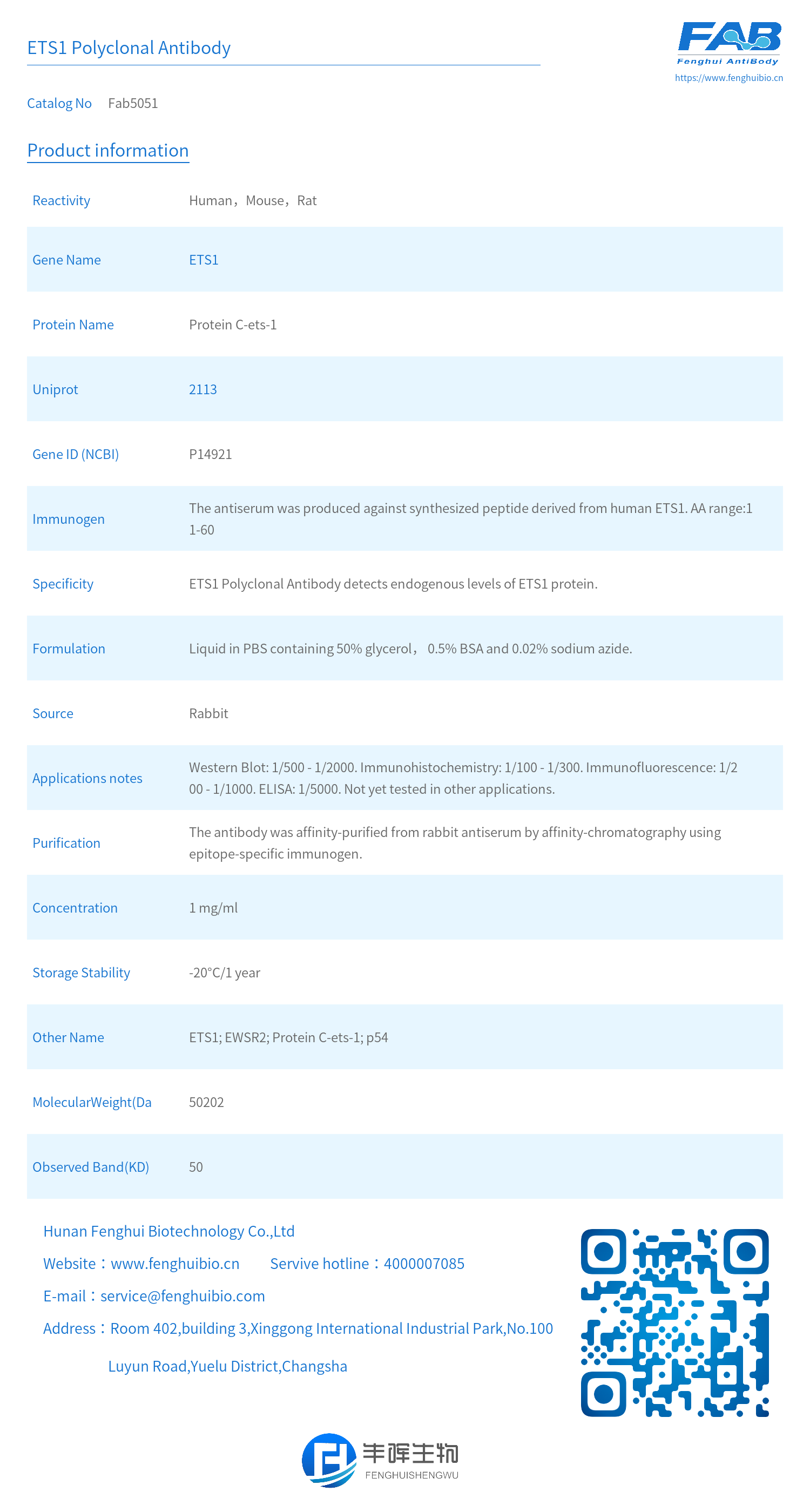 - Specificity: ETS1 Polyclonal Antibody detects endogenous levels of ETS1 protein.