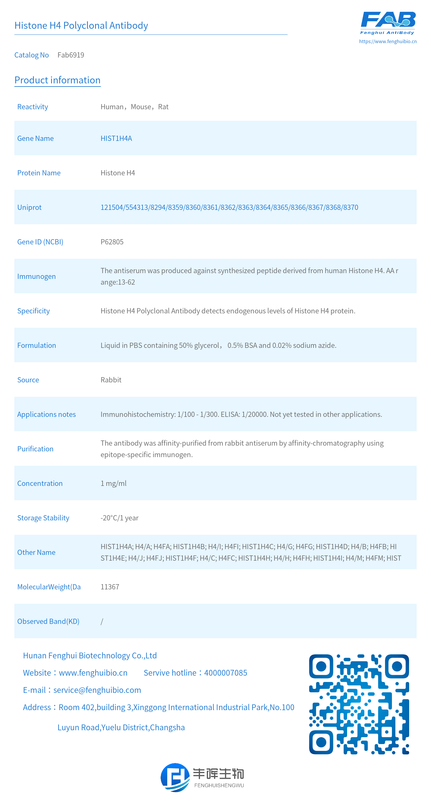 - Specificity: Histone H4 Polyclonal Antibody detects endogenous levels of Histone H4 protein.