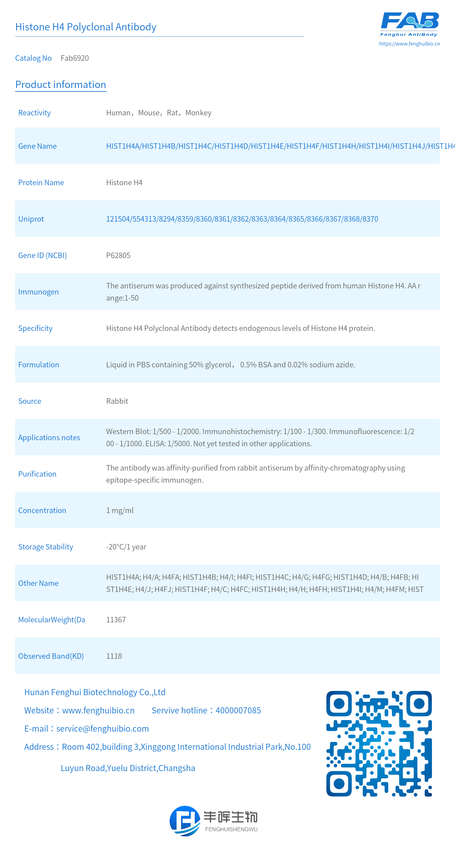 - Specificity: Histone H4 Polyclonal Antibody detects endogenous levels of Histone H4 protein.
