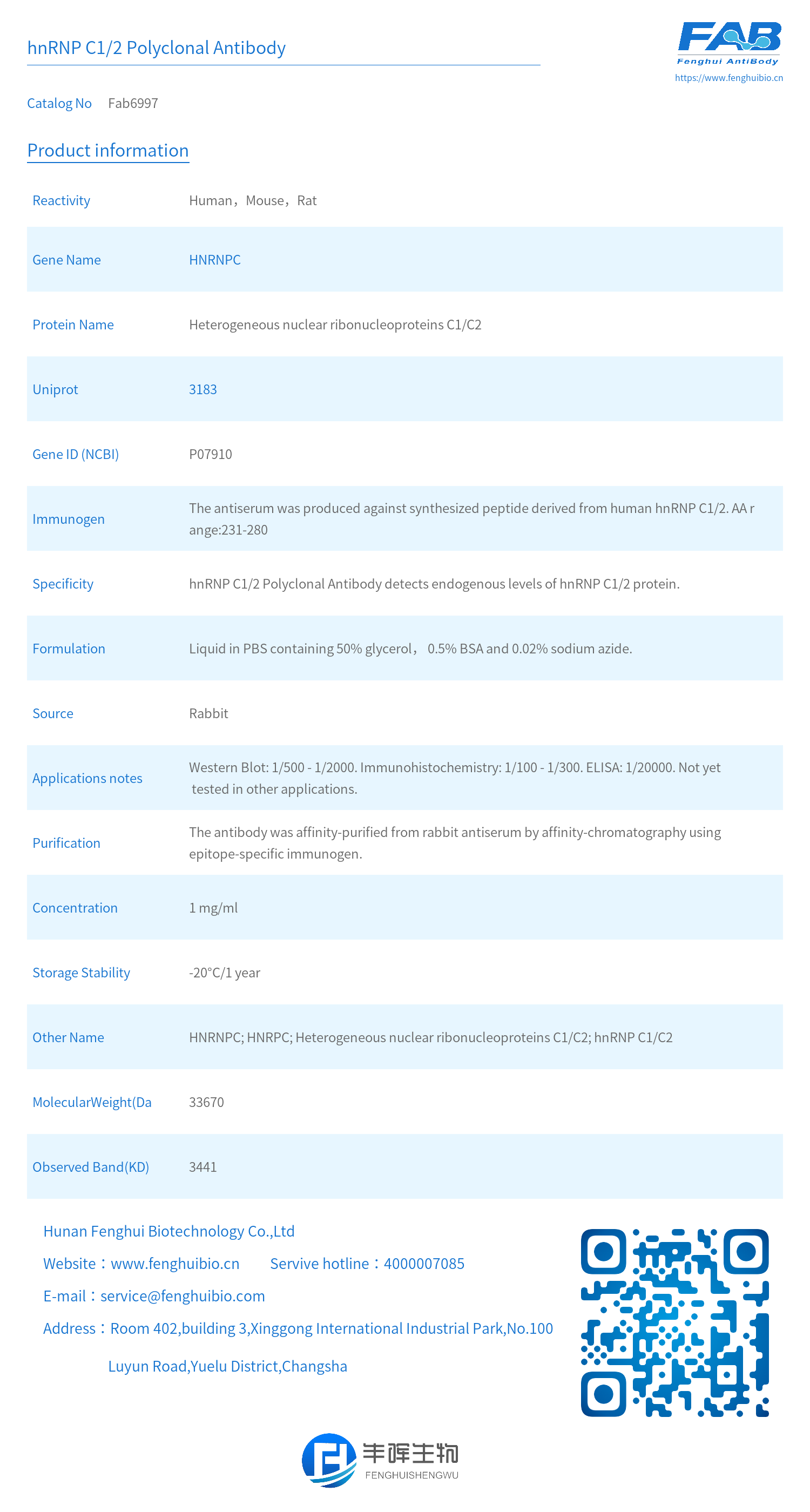 - Specificity: hnRNP C1/2 Polyclonal Antibody detects endogenous levels of hnRNP C1/2 protein.