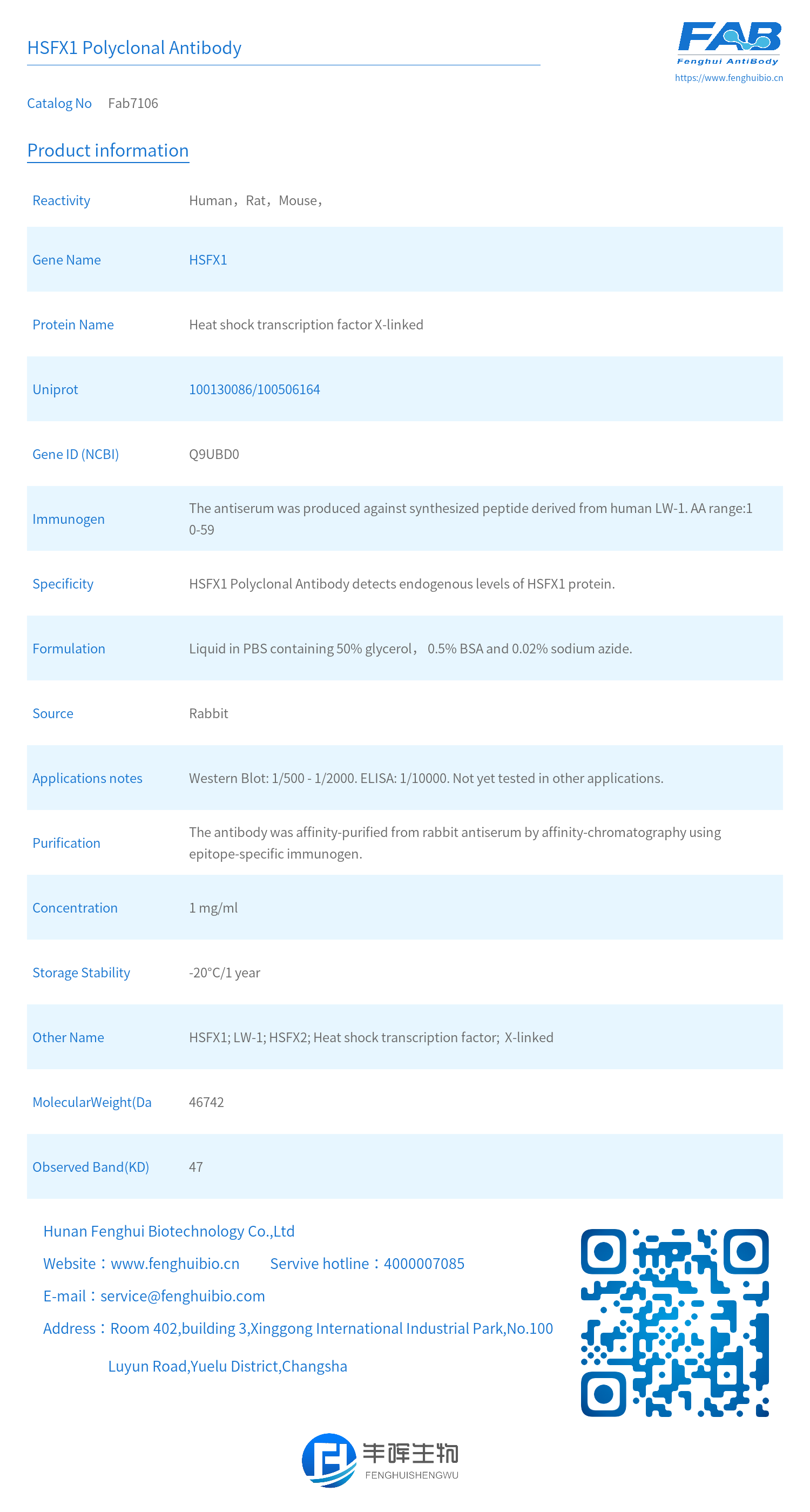 - Specificity: HSFX1 Polyclonal Antibody detects endogenous levels of HSFX1 protein.