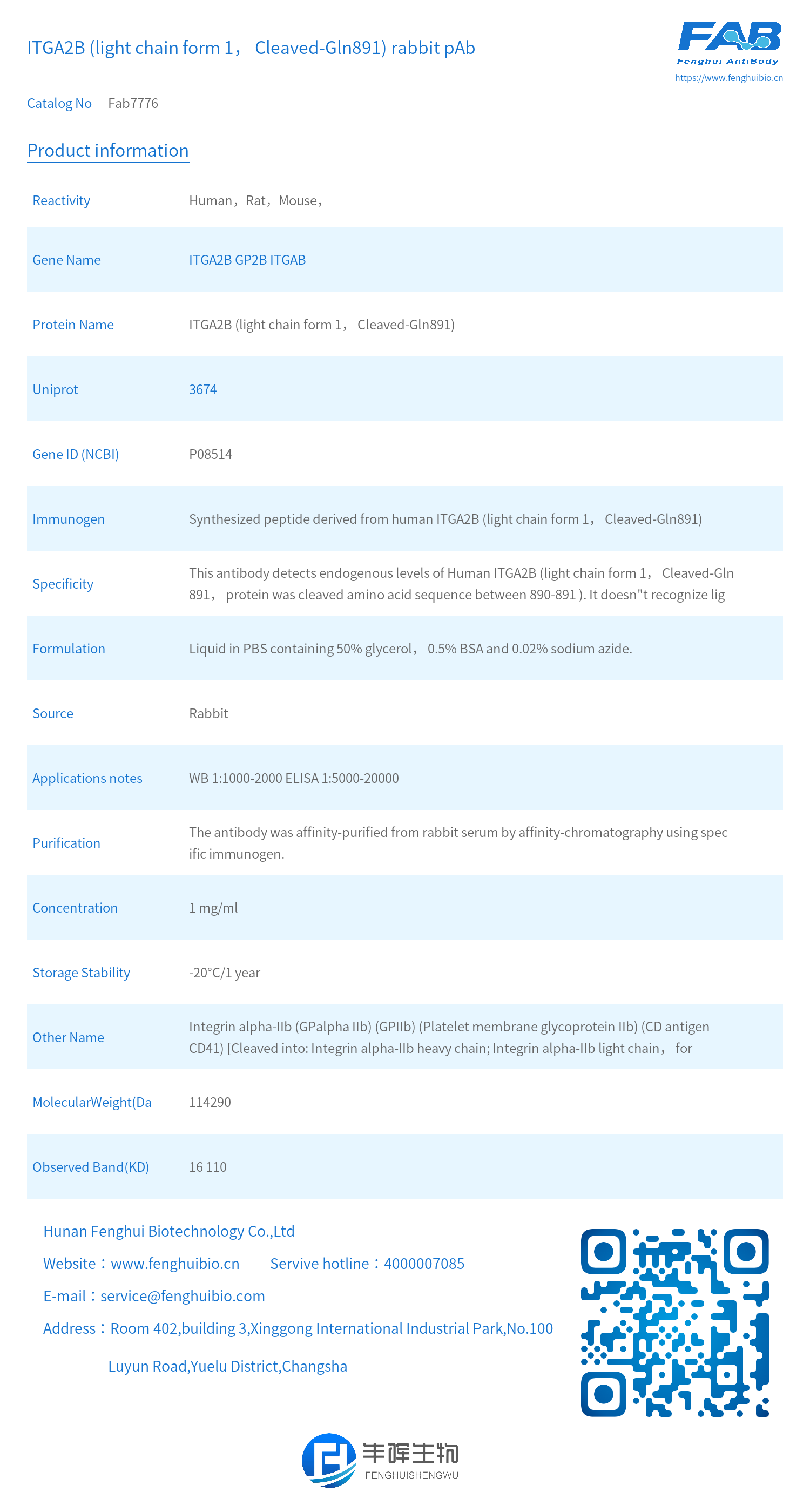 - Protein Name: ITGA2B (light chain form 1, Cleaved-Gln891)
