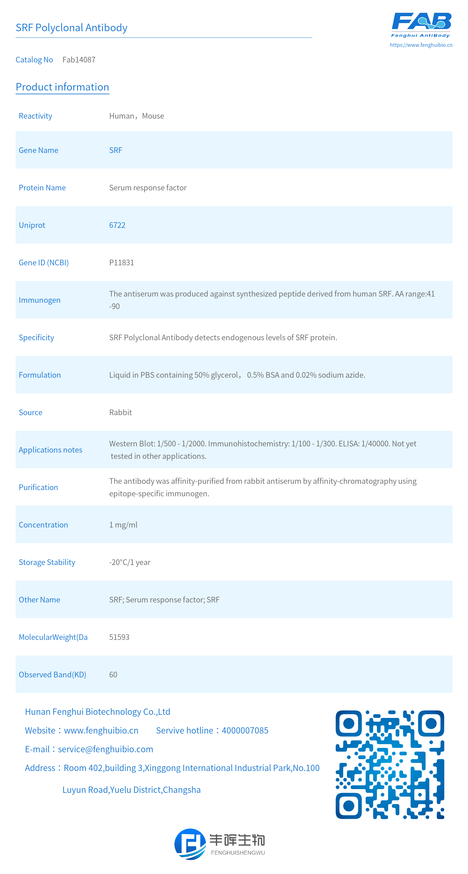 - Specificity: SRF Polyclonal Antibody detects endogenous levels of SRF protein.