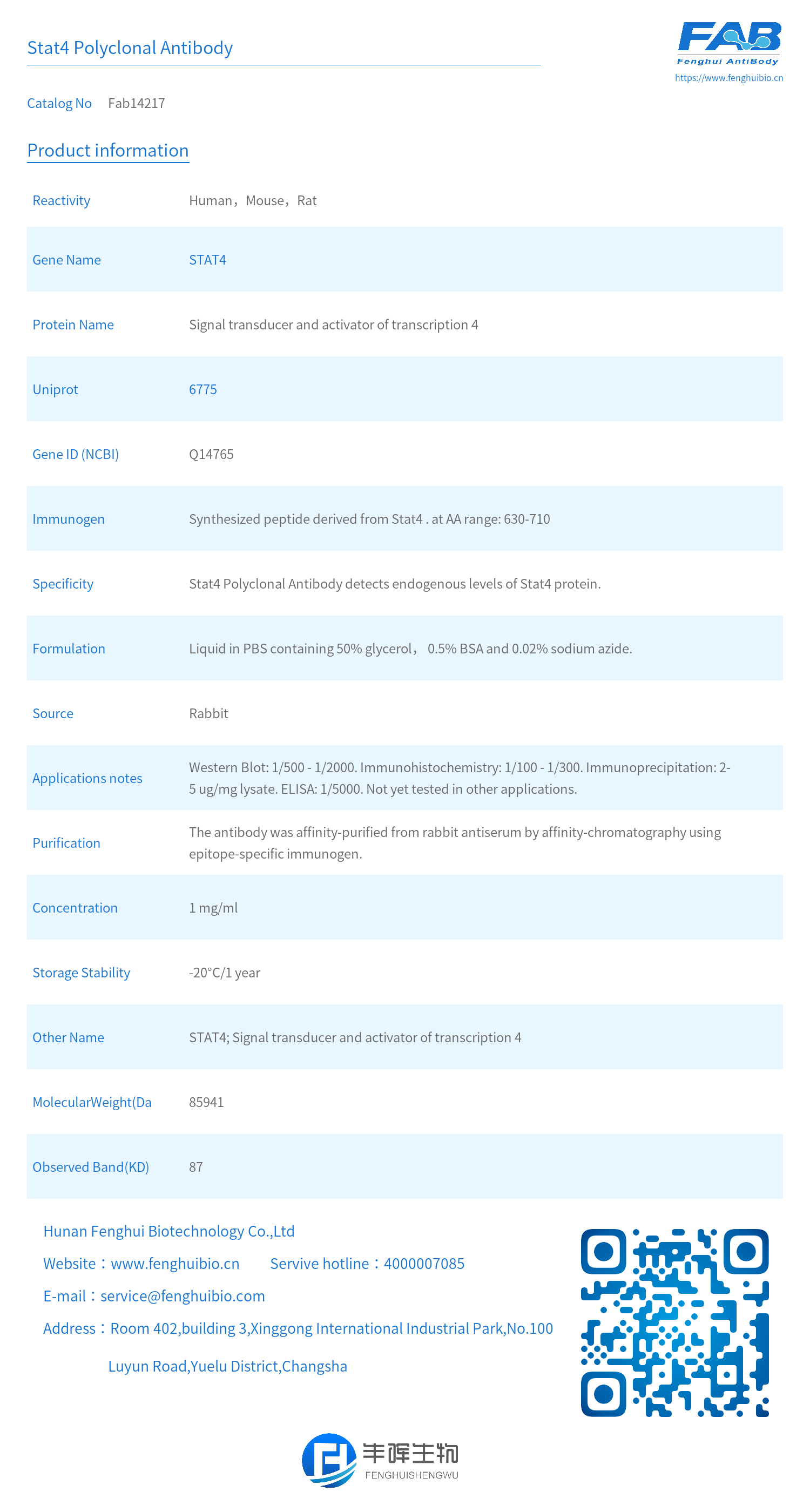 - Specificity: Stat4 Polyclonal Antibody detects endogenous levels of Stat4 protein.