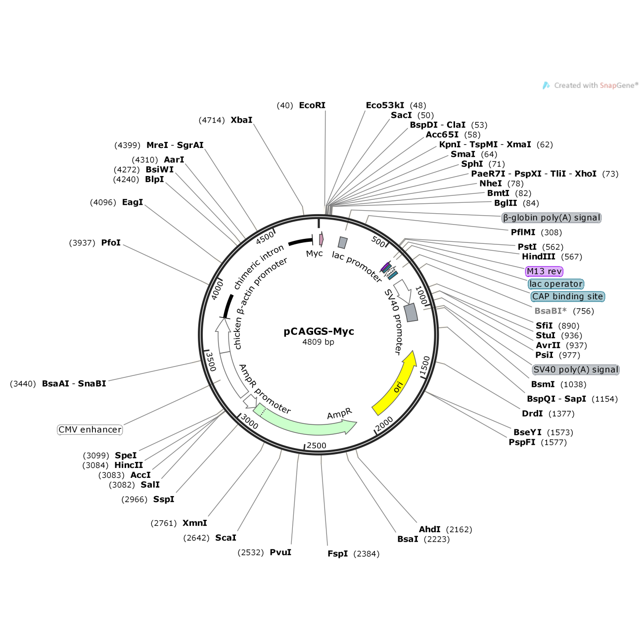 - 质粒简介: pCAGGS-Myc质粒是一个哺乳细胞真核表达质粒,CAG启动子驱动Myc标签和目的基因融合表达。本质粒由武汉淼灵生物科技有限公司构建并分享至淼灵质粒平台。