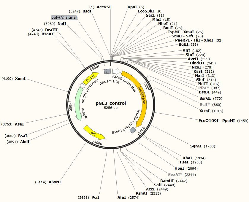 - 备注:pGL3-control是荧光素酶报告载体,含有SV40 增强子和启动子,增强荧光素酶的表达。