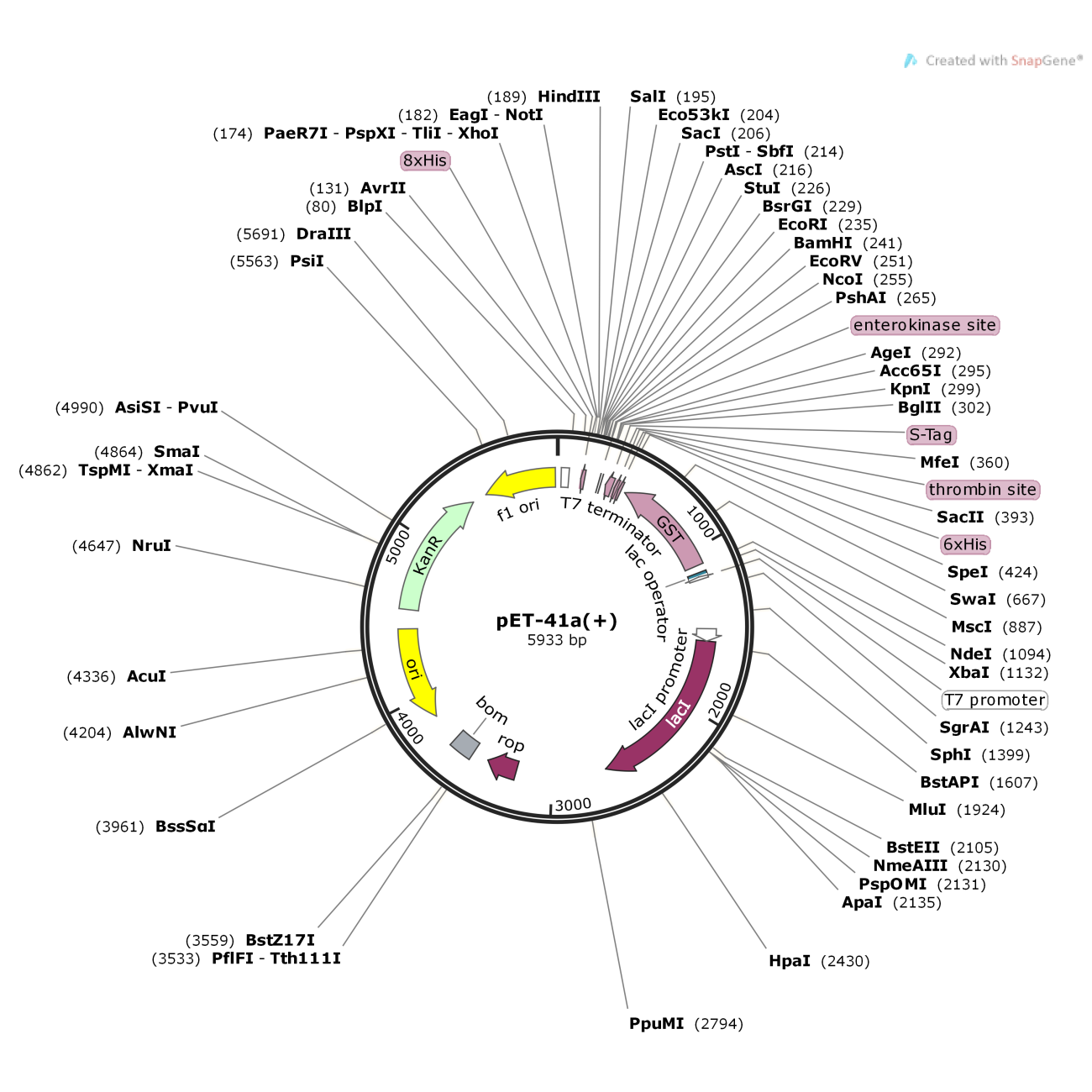 - 备注:Encodes GST fusion tag; Nterm thrombin cleavage site; Nterm enterokinase cleavage site; PshAI blunt cloning site; a,b,c vary by MCS