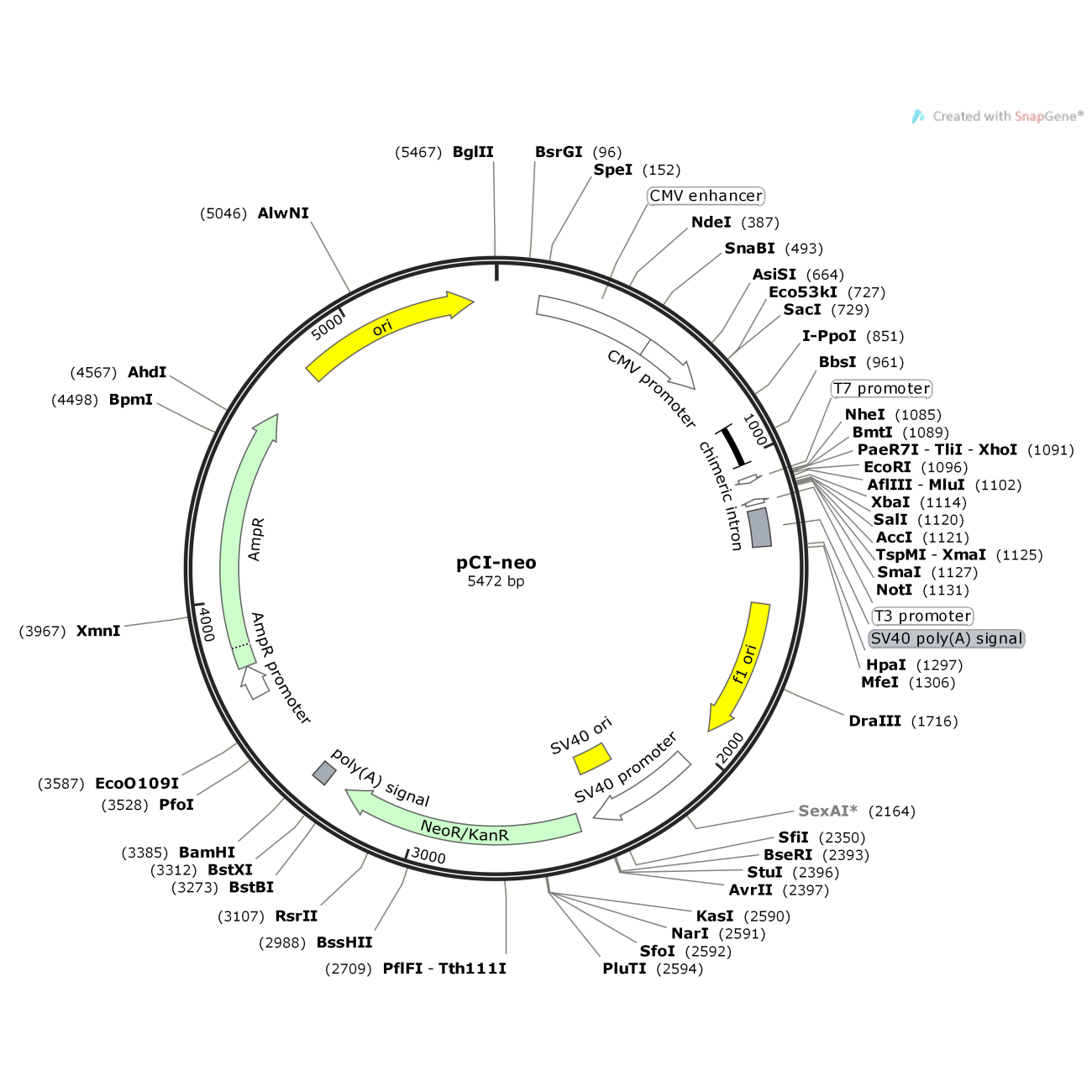 规格:20μl质粒质粒分类:哺乳细胞载体 质粒大小:5472 bp 原核抗性:Amp 筛选标记:neo 克隆菌株:DH5α
