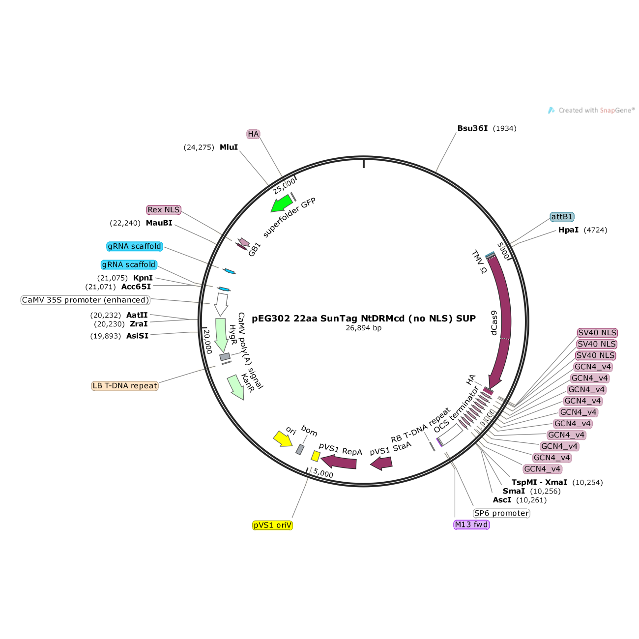 名称 pEG302 22aa SunTag NtDRMcd (no NLS) SUP 别称 Plasmid#115490 质粒宿主 植物 片段类型 CRISPR 原核抗性 Kan 荧光标记 绿色 复制子 pVS1 温度 37度 拷贝数 高 质粒用途 基因编辑 筛选标记 Hyg 感受态 Stbl3