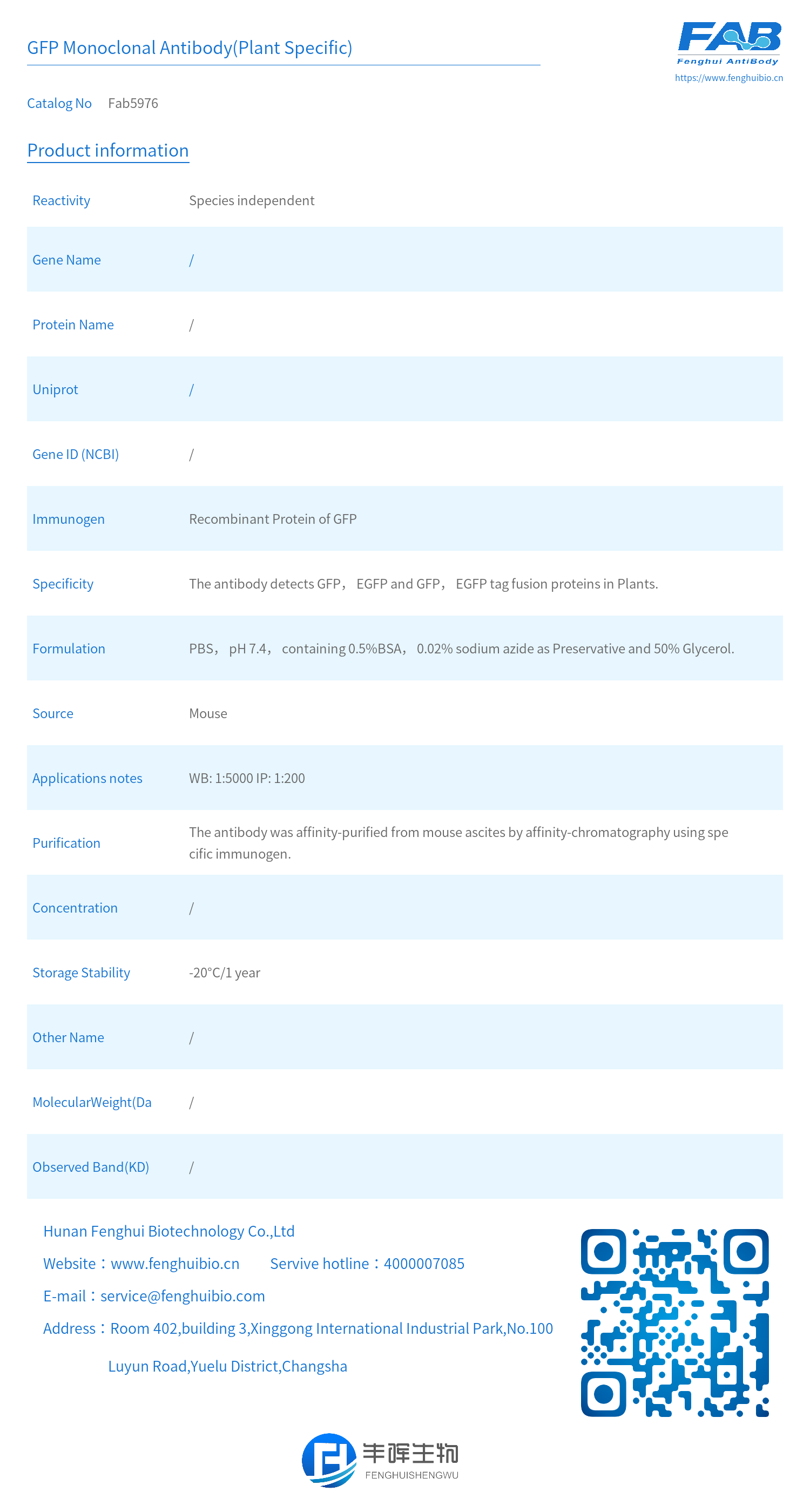 - Specificity: The antibody detects GFP, EGFP and GFP, EGFP tag fusion proteins in Plants.