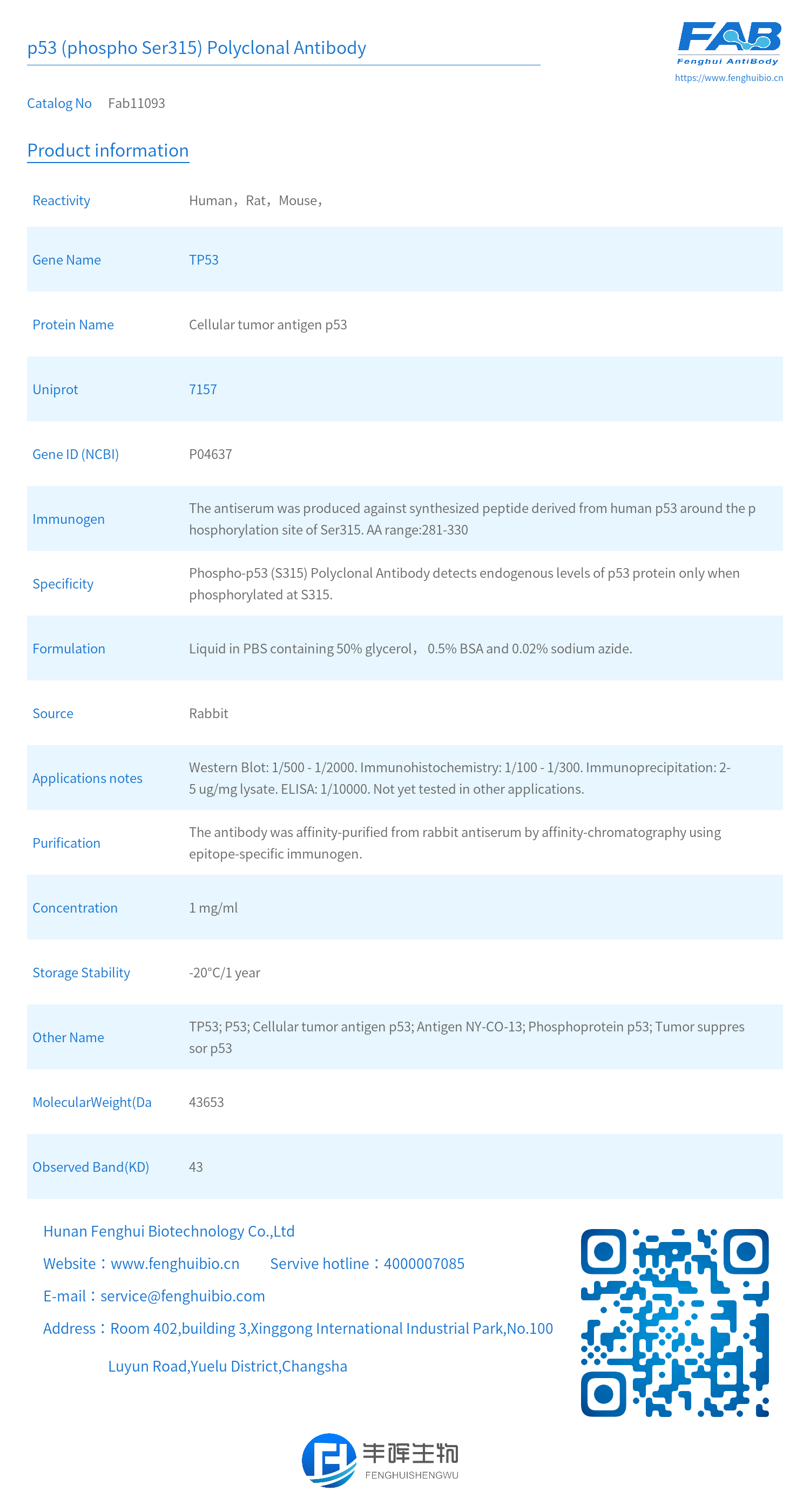 - Specificity: Phospho-p53 (S315) Polyclonal Antibody detects endogenous levels of p53 protein only when phosphorylated at S315.