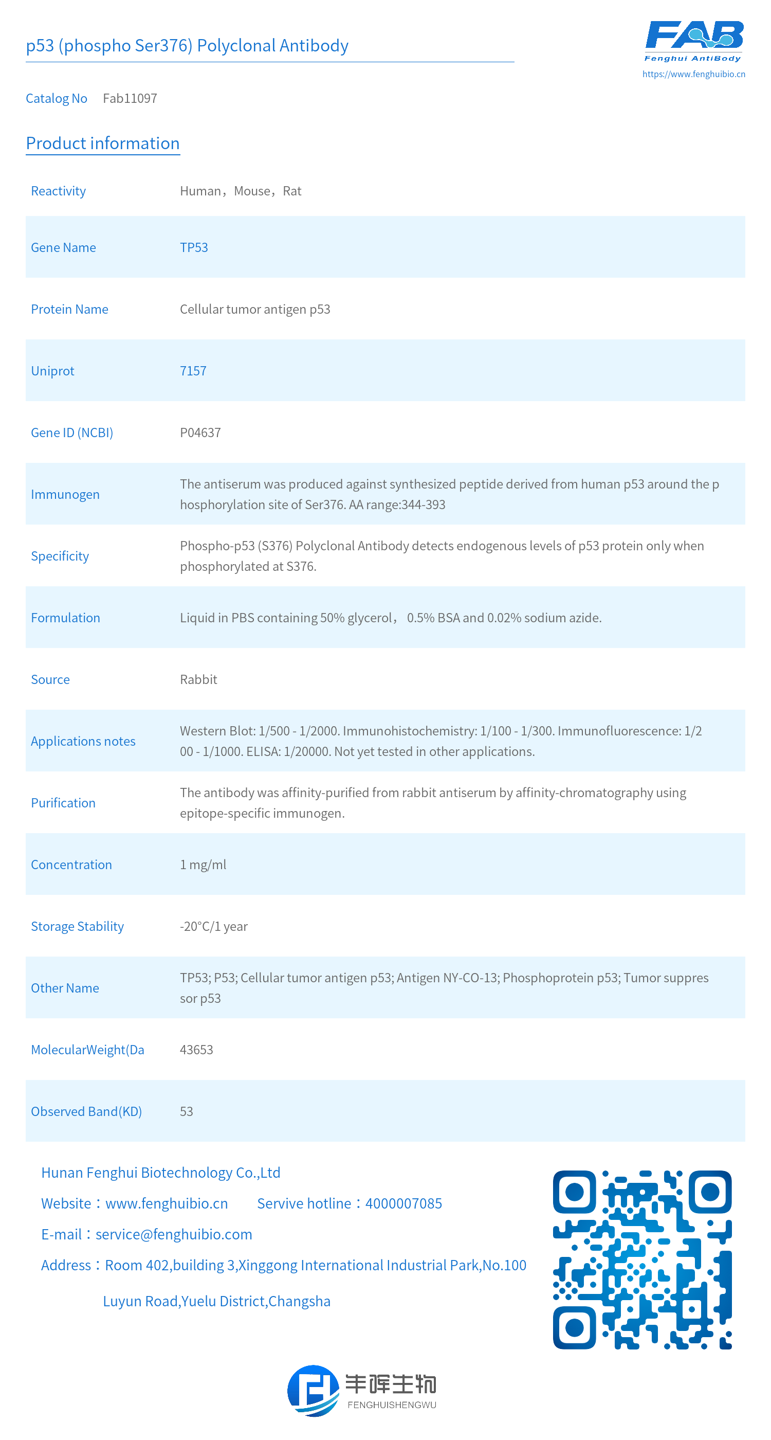 - Specificity: Phospho-p53 (S376) Polyclonal Antibody detects endogenous levels of p53 protein only when phosphorylated at S376.