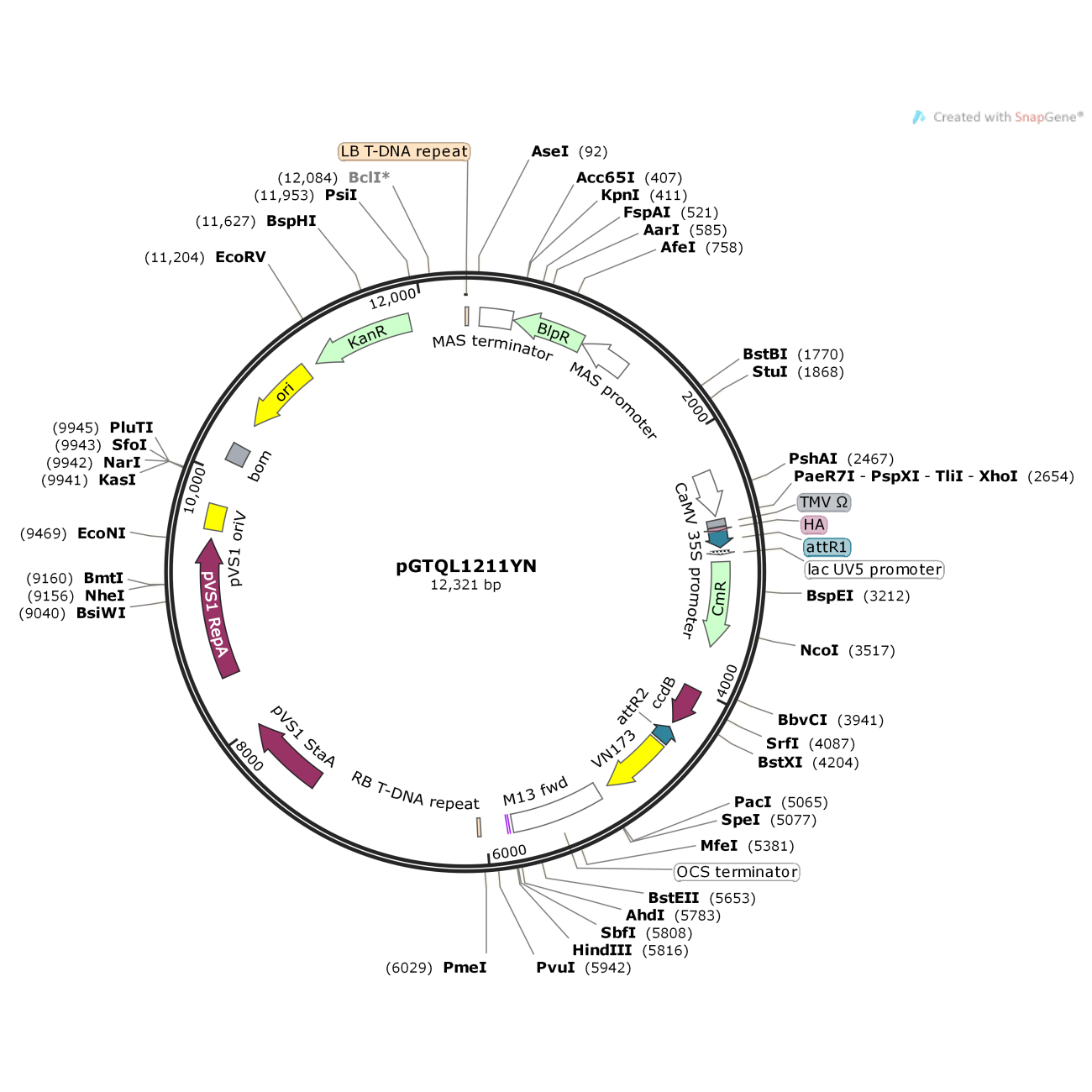 名称 pGTQL1211YN/pEarleyGate201-YN 别称 Plasmid#61704 质粒宿主 植物 片段类型 BIFC 原核抗性 Kan 复制子 pVS1 温度 37度 拷贝数 高 质粒用途 双分子荧光 片段物种 空载体 筛选标记 Zeo 启动子 35s