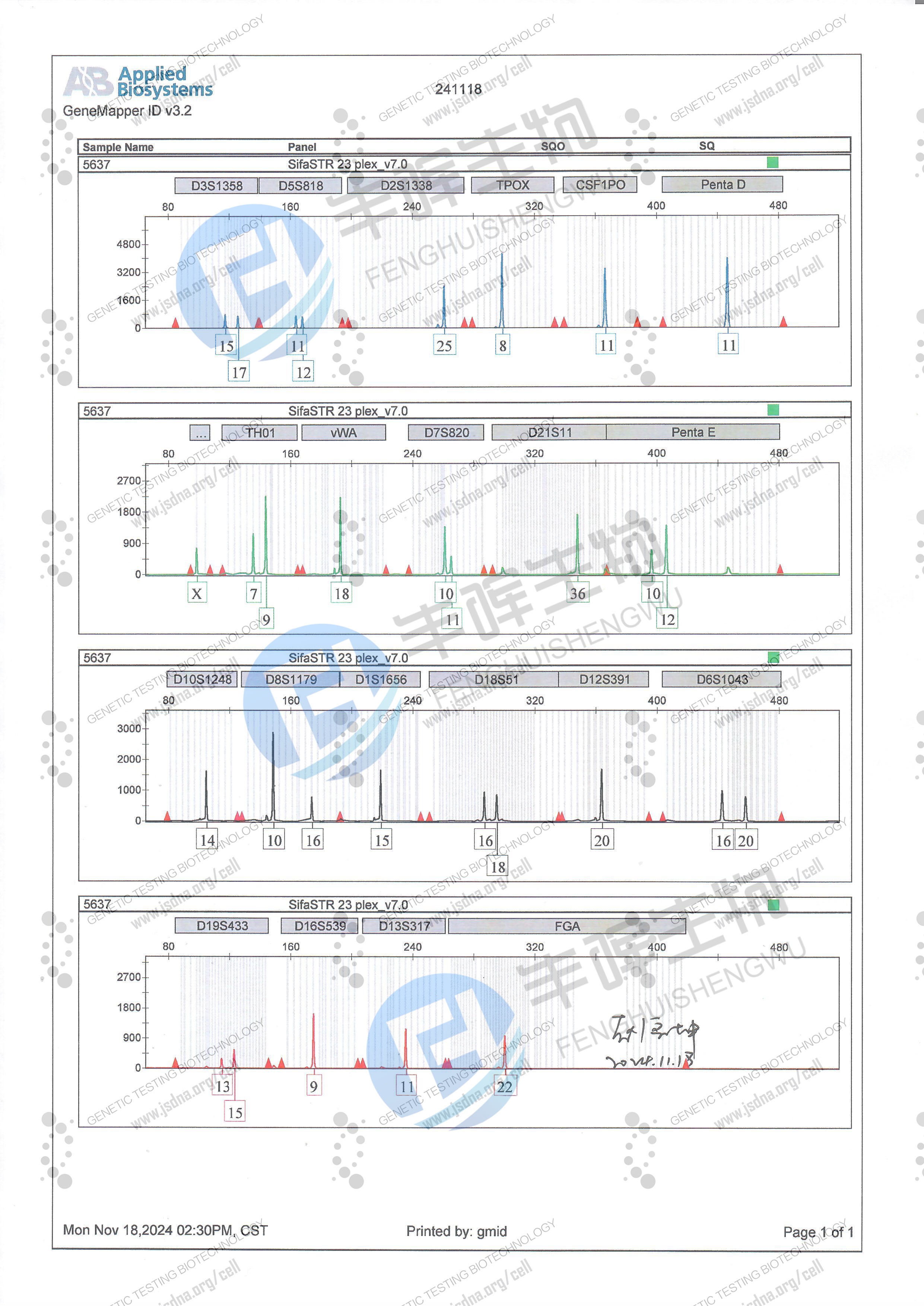同工酶 Me-2, 1, PGM3, 2, PGM1, 1, ES-D, 1, AK-1, 1, GLO-1, 1-2, G6PD, B 致瘤性 裸鼠 病毒 ELISA:逆转录酶阴性;PCR:埃博拉病毒、HBV病毒、丙肝病毒、HHV病毒、HIV-1病毒、HIV-2病毒、HTLV病毒、MLV病毒、SMRV病毒 核型 Phenotype Frequency Product: 0.0056. STR鉴定STR位点信息STR鉴定图![]()