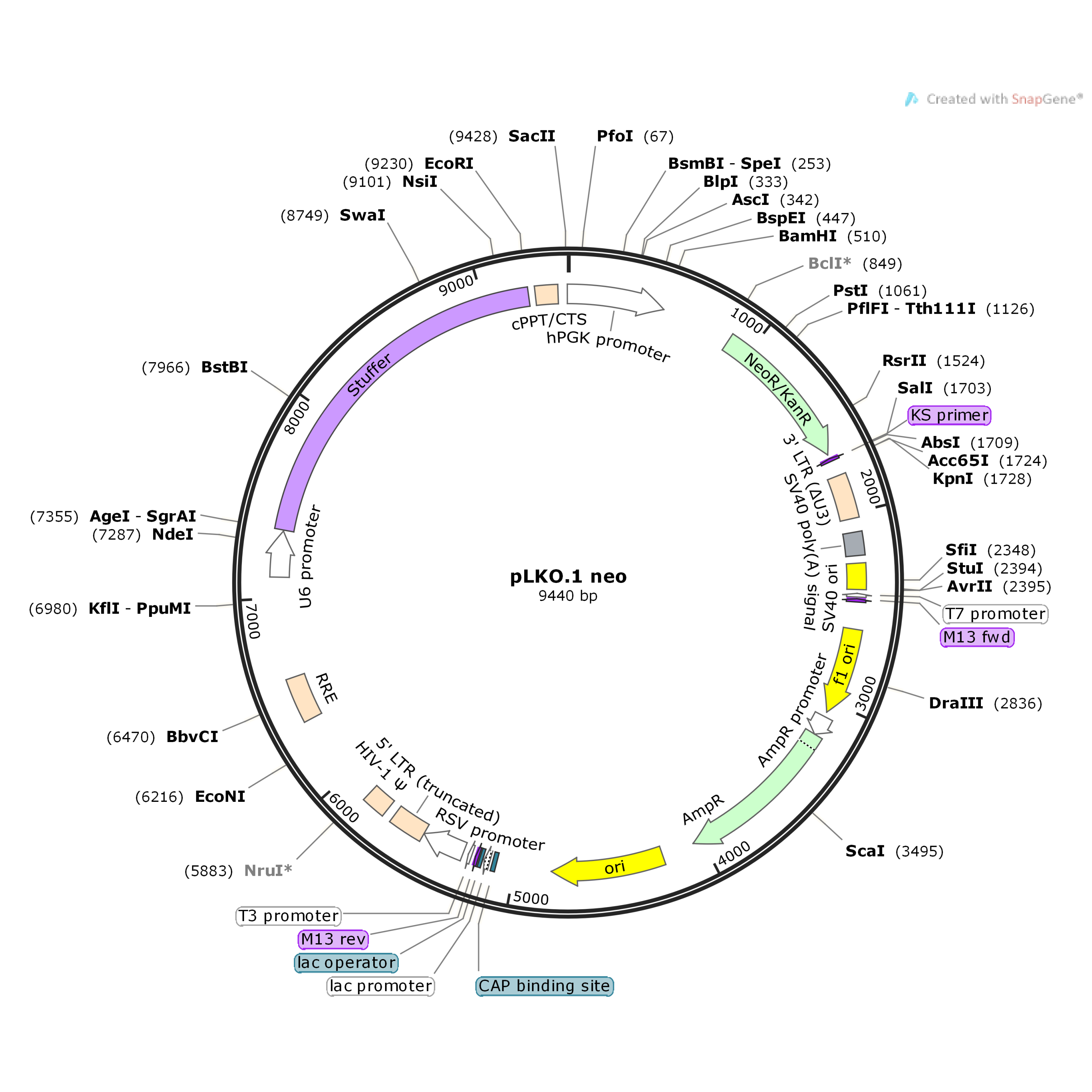 规格:20μl质粒质粒分类:慢病毒载体, RNAi载体 质粒大小:9440 bp 原核抗性:Amp 筛选标记:Neo 克隆菌株:stbl3